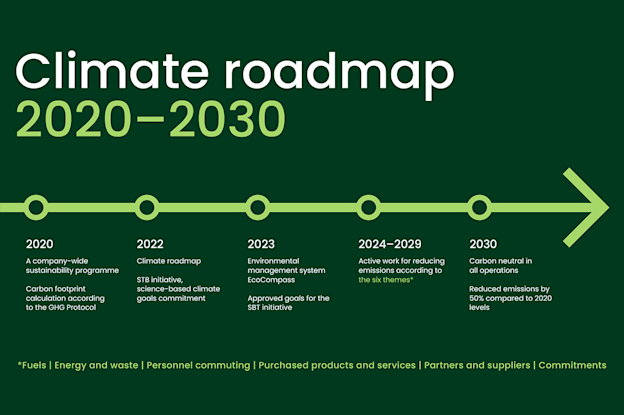 Our sustainability work is based on our ambitious sustainability objectives, which we pursue through concrete, verifiable and measurable actions. We promote the UN Sustainable Development Goals in our own operations and throughout our value chain as part of our sustainability programme. We have set science-based climate targets, which were endorsed by the Science Based Targets initiative (SBTi) in September 2023. Our goal is to halve emissions from all our operations and be carbon neutral by 2030.
